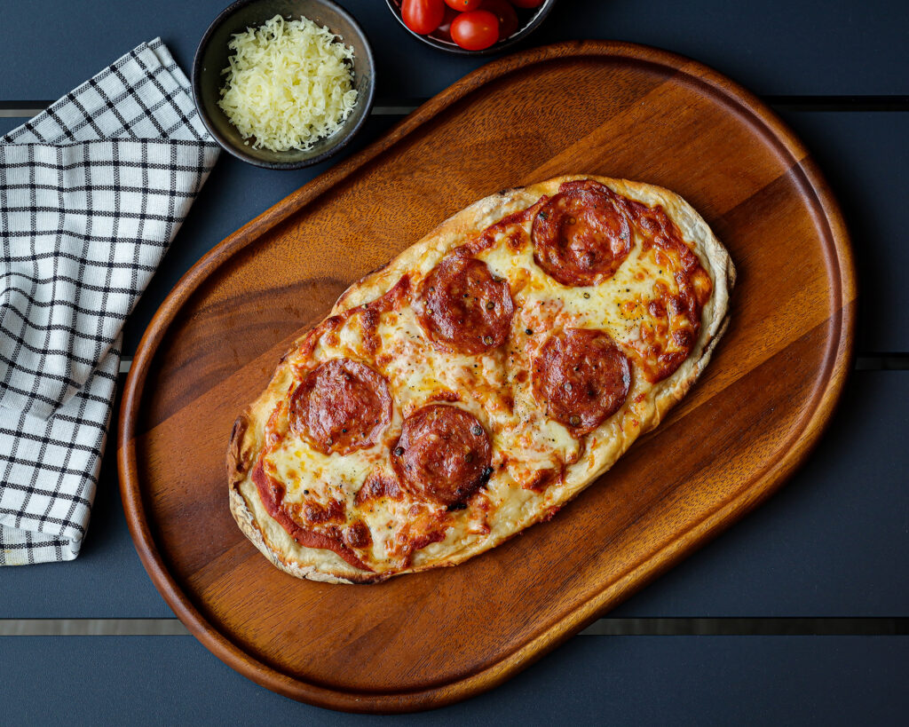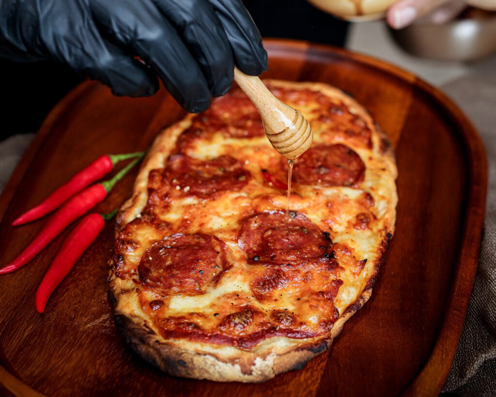 Tomato sauce, mozzarella, pepperoni, chili oil, honey drizzle. Sweet heat, crispy pepperoni — addictive.