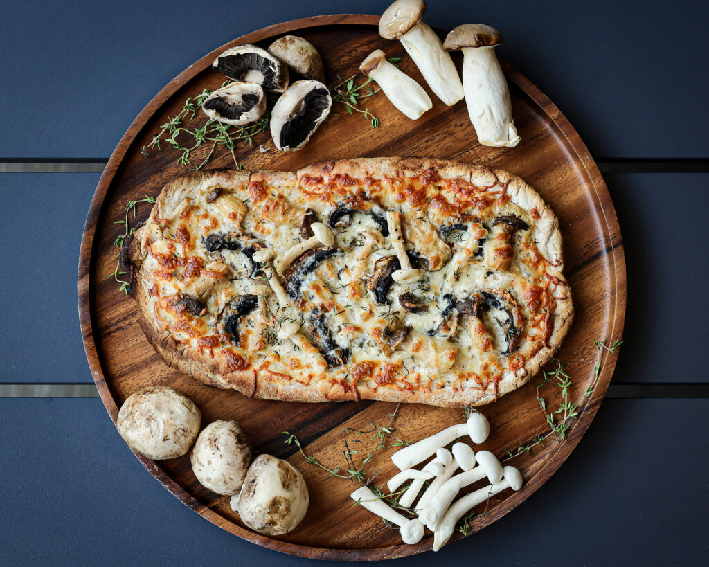 Garlic cream, mozzarella, sautéed mushrooms, thyme.