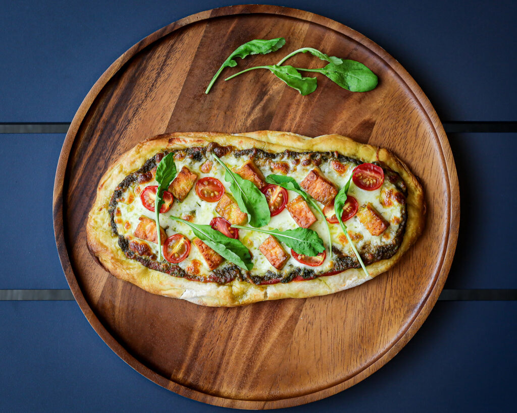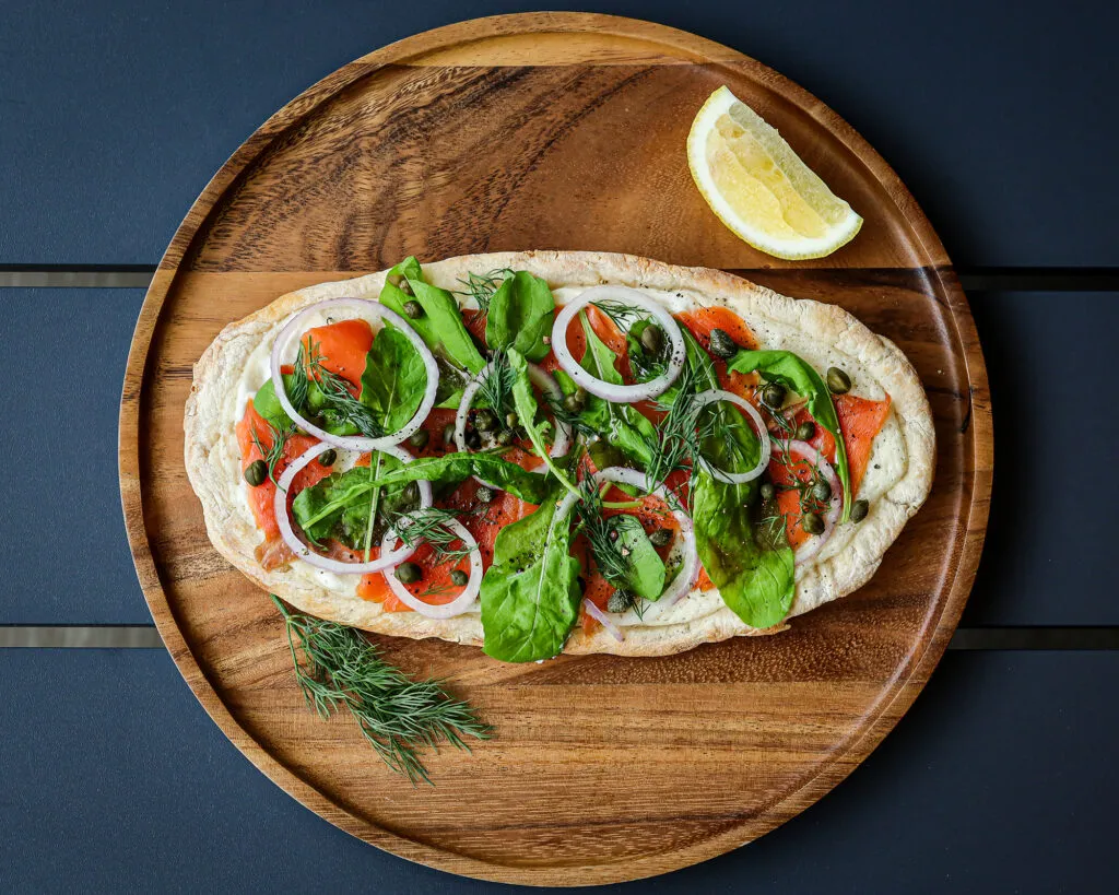 Dill crème fraîche, smoked salmon, red onion, capers, rocket. Nordic spa vibes on a crisp base.