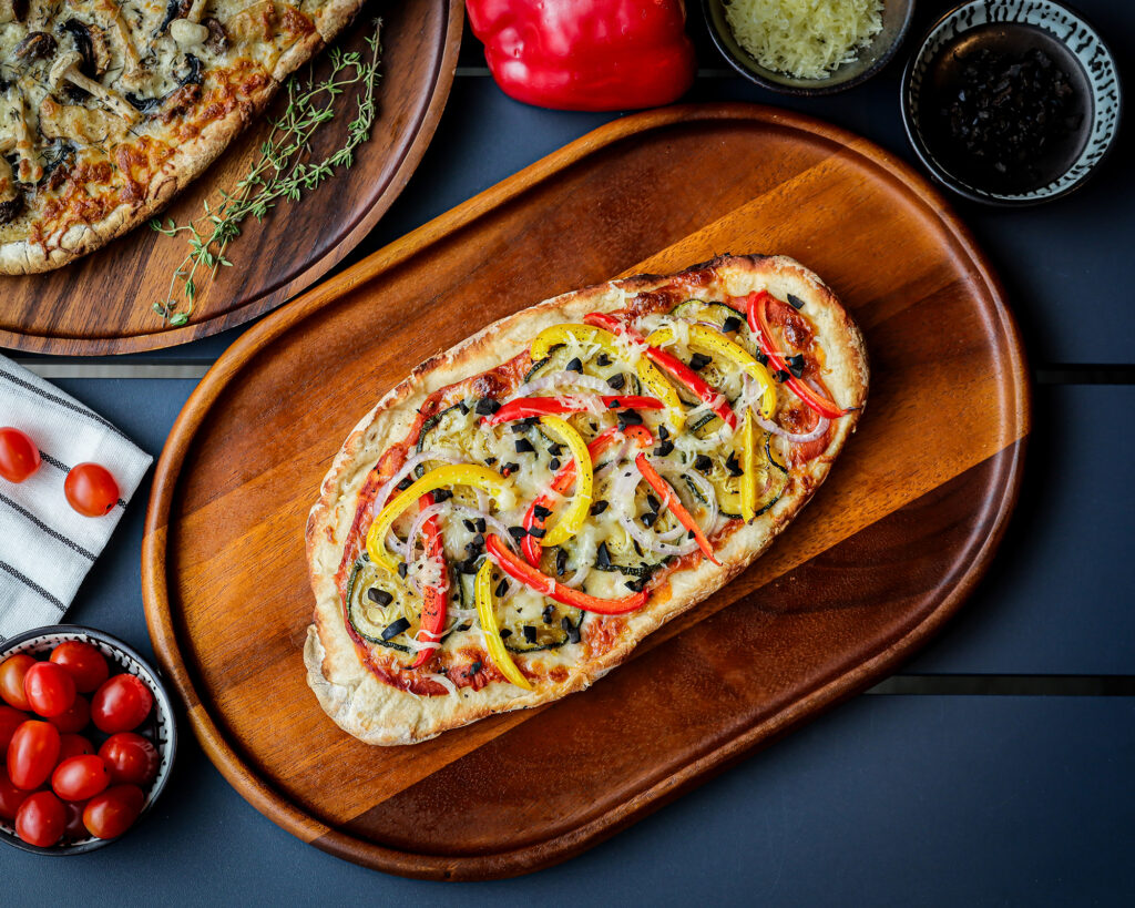 Tomato sauce, mozzarella, peppers, red onion, olives, zucchini & mushrooms. A colorful, veggie-packed delight.