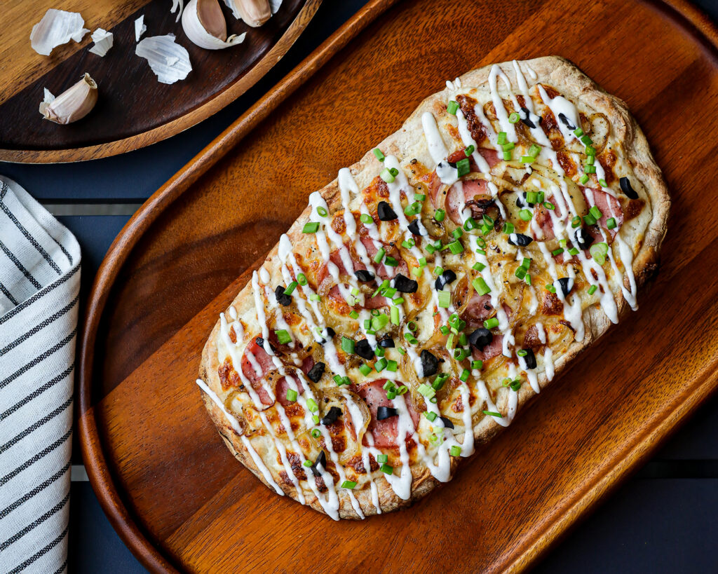 Garlic cream, smoked sausage, caramelized onion, mozzarella, dill oil.