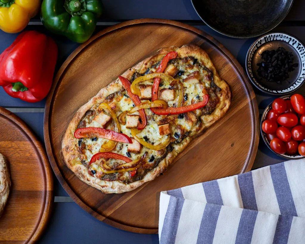 Basil pesto, tomato sauce, mozzarella, marinated chicken, peppers.